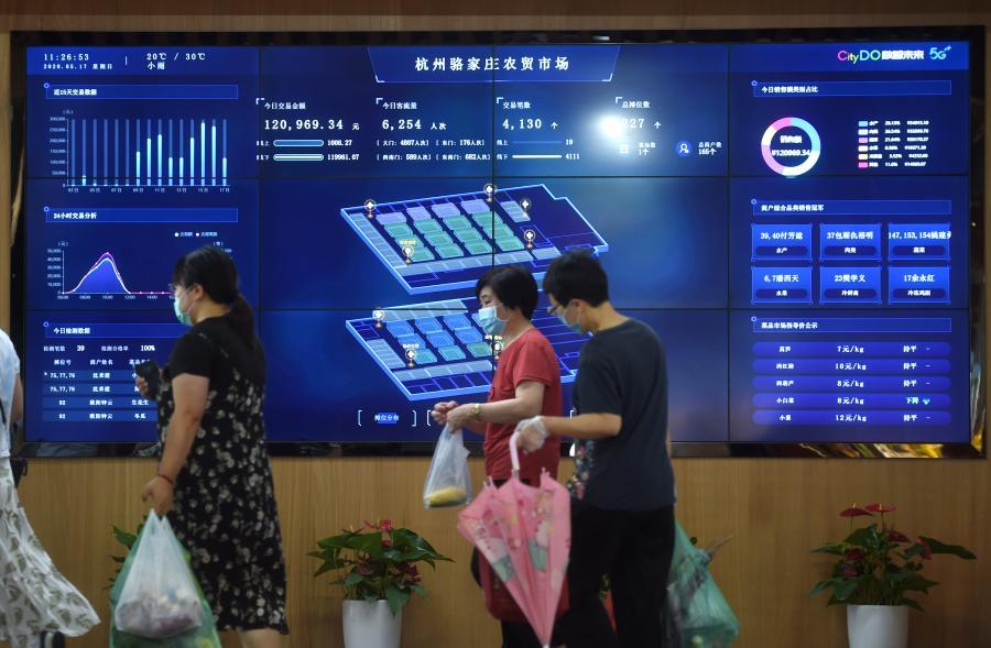 △浙江省杭州市的5G农贸市场——骆家庄农贸市场的大屏幕上实时显示交易、客流等相关情况(2020年5月17日摄)。新华社记者 韩传号 摄